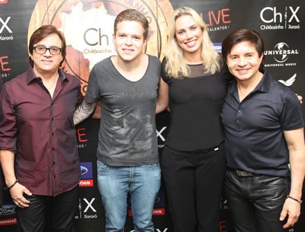 Os produtores da CWB Brasil João Gilberto e Carol Cadilhe com Chitãozinho e Xororó, minutos antes da dupla subir no palco do Guaíra, sábado à noite, com casa lotada.