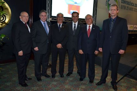 Registro da 11ª edição do Convergência, evento realizado em Curitiba semana passada que reuniu tabeliões de todo o Brasil para debater a prática do protesto de títulos no país. O encontro também celebrou os 25 anos de fundação do Instituto de Estudos de Protestos e Títulos do Brasil. Da esquerda para a direita: Germano Carvalho de Toscano Brito (1º Secretário do IEPTB), Rogério Bacellar (presidente da Associação dos Notários e Registradores Brasil), Leo Almada (presidente do IEPTB), João Norberto França (presidente do IEPTB-PR e vice-presidente da Anoreg-PR), Claudio Marçal (vice-presidente Anoreg-BR) e Robert Jonczyk (presidente Anoreg-PR).