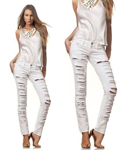 O jeans “destroyed”, como também é chamado o jeans rasgado, é o desejo do momento, seja em calça, shorts, saia etc. Como acontece muito no mundo da moda, as tendências vão e voltam. Os jeans rasgados já fizeram sucesso anos atrás e agora voltam a aparecer, mas desta vez as peças ganham uma releitura. Além de rasgados e desfiados, os jeans estão bem destruídos na parte da frente, principalmente as calças. A intenção é justamente mostrar um pouco das pernas.