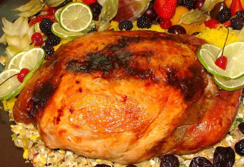 No cardápio, há opções com as tradicionais aves natalinas, como o peru desossado recheado com brioche, maçã, ameixa e damasco, decorado com frutas natalinas acompanhado de farofa rica e molho madeira; chester recheado com farofa de castanha, decorado com frutas e fios de ovos, farofa doce e molho de demi glacê; peito de peru recheado com maçã e damasco envolto em massa folhada. Além das aves, como prato principal, haverá tender bolinha assado, lombinho de porco recheado com maçã e damasco e o tradicional bacalhau assado com batatas, azeitonas, pimentões coloridos e azeite extra virgem. Para a ceia do Ano Novo, a sugestão é o leitão inteiro assado, recheado e decorado.