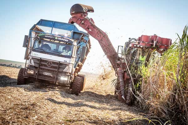 Terminado o carregamento, o motorista assume o controle do Axor para a etapa de transbordo aos treminhões, ou seja, o descarregamento da carga nos caminhões de maior capacidade, que completam o ciclo de transporte levando a cana às usinas de açúcar e etanol.