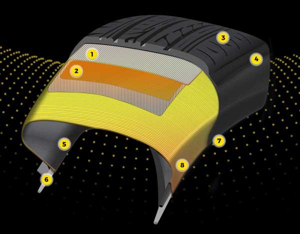 8 – A Tecnologia da carcaça: A carcaça é responsável por garantir a estrutura e sustentação do pneu e pode ser composta por diferentes materiais (como nylon, poliéster e outros componentes) que oferecem resistência à pressão, peso e choques.