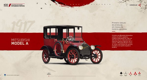 Uma história de pioneirismo, tecnologia e inovação. Em 2017, a Mitsubishi Motors comemora 100 anos da fabricação de seu primeiro veículo. Para celebrar a data, a Mitsubishi Motors lança um site com informações dos principais modelos lançados ao longo deste século. Para ver o hostsite acesse: www.mitsubishimotors.com.br/portal/100anos-mit