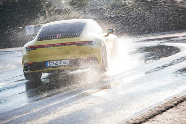 Quando o modo de condução Wet é ativado, o PSM, o PTM, a aerodinâmica adaptativa, o sistema opcional Porsche Torque Vectoring (PTV) Plus e as respostas à condução são adaptadas para garantir máxima estabilidade na direção. Acima de 90 km/h, o defletor traseiro variável é estendido para a posição de alta performance, os flaps de resfriamento abrem, a reação ao pedal do acelerador fica mais suave e a função Off do PSM ou do modo Sport não pode ser ativada. A entrega de torque do motor é mais suave e a estratégia de troca de marchas da nova transmissão PDK de oito velocidades se adapta automaticamente a essa condição. No caso do modelo 911 Carrera 4S, com tração nas quatro rodas, é transferida mais força para o eixo dianteiro do que normalmente, para reforçar o efeito de estabilização. O diferencial traseiro blocante controlado eletronicamente também passa a utilizar diferentes índices de bloqueio como parte do ajusta do 911 às condições de pista molhada.